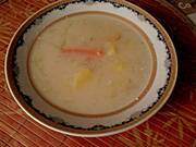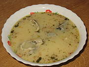 Barszcz biały na bogato- z ziemniakami, kiełbasą, jajkiem na twardo, przysmażoną cebulką i grzybkiem suszonym.
