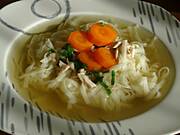 Rosół z makaronem i fasolka perłowa po bretońsku z pieczywem.