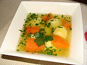 Rosół, bitki w sosie serowym, ziemniaki, marchewka z groszkiem.