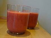 Zupa pomidorowa z makaronem gwiazdki (kółek w sklepie brak ;), na drugie pierogi z miesem i kapusta, koktajl truskawkowy
