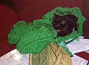 Czarny pomocnik (pomocnica) kilka razy poplątał mi włóczkę, zeziarł kawałek gazety z wzorami warkoczowymi, obgryzł guziki w swetrze w którym byłam..