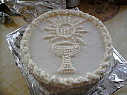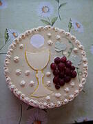 Ja robiłam w dużej blaszce, a dekorowałam tak- kielich zrobiłam z oszukanego marcepana i "wychodzące" z niego zielone winogrona, które obtoczyłam w zielonej galaretce, do tego czekoladowe listki. Może nie było to jakieś wykwintne, ale dość ładne, bo potem poproszono mnie o przygotowanie takiej samej dekoracji na inną komunię.