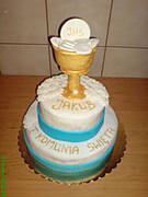Ja na taka większą komunie upiekłam tort w kształcie kielicha. Kielich to duży okrągły tort przycięty z boku, podstaw kielicha to fragment odcięty z boku odpowiednio skrócony. Hostia to malutki okrągły torcik z tortownicy wielkości talerzyka deserowego. W tym wypadku całość udekorowana śmietaną białą i ufarbowaną żółtym barwnikiem spożywczym. Przed podaniem dołożyłam jeszcze błyszczące perełki cukrowe. Można ewentualnie udekorować kielich winogronem lub dowolnie według własnego uznania. W zależności jaki duży tort jest potrzebny wystarczy użyć większej lub mniejszej tortownicy.
