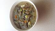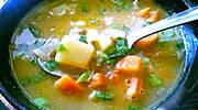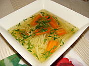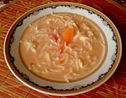 Krupnik zabielany z ziemniakami, miało byc na drugie risotto ale maz juz zrobil nalesniki :))) do picia sok z pomaranczy