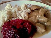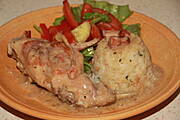Królik w śmietanie ,z żurawiną, rozmarynem i czosnkiem ...podany z chrupiącymi plasterkami wędzonego boczku i kluseczkami ziemniaczanymi ... do tego miks surówek:)