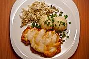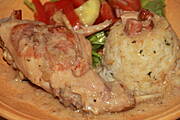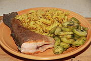 podany z ryżem aromatyzowanym liściem, zielem i lubczykiem oraz surówką mix :))