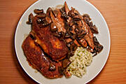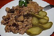 Potrawka kurczaczo-kacza z pieczarkami, pęczak i ogórki kons. NIGDY w życiu nie jadłam pęczaku, a teraz za każdym razem mi coraz bardziej smakuje.