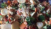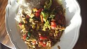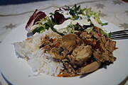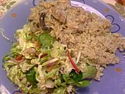 Potrawka z kurczaka ,ryż ,mix sałat z sosem czosnkowym ..