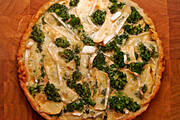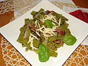 Makaron szpinakowy z pesto genovese, szynką parmeńską i peperoni.