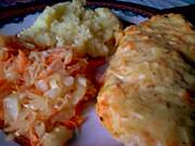 Piersiątko kurczęce zapiekane pod marchewką,ziemniaki,surówka z kiszonej kapusty.