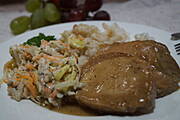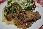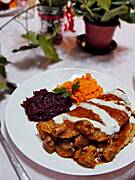 Polędwiczki drobiowe w sosie pieczarkowym, kotlety ziemniaczano-serowe, surówka.