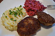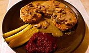 "Perłowe" kotlety serowe (czyli kotlety z kaszy jęczmiennej perłowej, twarogu i podsmażonego boczku z cebulką) z sosem borowikowo-pieczarkowym, do tego korniszony i ćwikła z chrzanem..