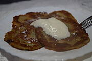 Wczorajszy krupnik z ziemniakami, na drugie placki ziemniaczane z jogurtem greckim i cukrem, do picia sok z pomaranczy.