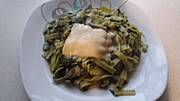 Spaghetti z sosem z szynką i zielonym groszkiem.