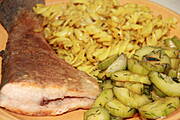 Pstrąg łososiowy z patelni, makaron czosnkowo-curry i ogórki z balsamico :))