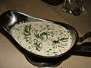 Podane z sosem czosnkowym z fety i jogurtu, i z ketchupem.
