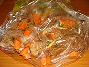 Pierś z kurczaka w papirusie z ziemniakami , brokułami na parze i karmelizowaną marchewką , do picia sok jabłkowy