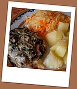 Rolady z kurczaka,sos grzybowy,ziemniaki,surówka z kiszonej kapusty.