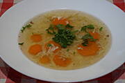 Rosół z kaczki z domowym makaronem, na drugie kotlety z piersi kurczaka, marchewka tarta i ziemiaki, do picia sok z wisni.
