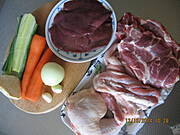 - ćwiartka kurczaka ze skórką, boczek, karkówka, wątroba - i widać na 4. zdjęciu 3/4 szklanki rosołu, to też poszło w pasztet - no i przyprawy wieńczą dzieło.