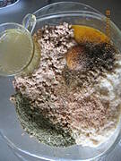 to moja "baza"...czasem kombinuję z drobiowym mięsem, ale jakos bardziej nam smakuje wieprzowina, zwykle robie z poczwórnej porcji i wtedy kombinuje z dodatkami piekąc w mniejszych aluminiowych foremkach-kiedys był z pistacjami, z oliwkami, z grzybami, z suszonymi pomidorami