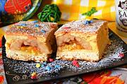 Czy ja dobrze myśle ciasto kruche połówki jabłek wypełnione pomarańczowym dżemem , zalane budyniem i kolejna warstwa ciasta . Tylko czy to jest tradycyjne kruche czy takie z dodatkiem sera . Wyglada bosko .