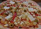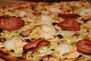 Wersja ,,dorosła" z krewetkami, oliwkami, kiełbasą i cebulką na białym sosie śmietanowo-serowym :))