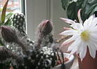 A na parapecie kwitnie kaktus "Krolowa nocy". Niestety piekno krotkotrwale, po kilku godzinach kwiaty padaja.