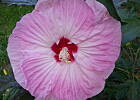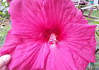 Pierwszy raz, pierwszy kwiat, 20 cm średnicy. Co ja będę gadała, w tle widać słonecznik (i palec) i jest porównanie. Drodzy moi - hibiskus bagienny. Ale się cieszę!