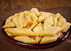 bardzo dobre jest z serem, ale spokojnie możesz zrobić z kruchego ciasta, nawet na całym jajku i odrobinie kwaśnej śmietany. Tylko proszku do pieczenia dodaj minimalnie, żeby ciasteczka nie straciły kształtu podczas pieczenia :)