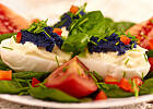 Uwielbiam jajka z kawiorem. Oczywiście wiadomo...kogo stać na prawdziwy kawior z bieługi... No to na święta kupuję kawior z gorbuszy, albo z innych jesiotrowatych(w Makro)) i robię wg tego, co podejrzałam w ruskich "riestoranach", a nawet bedąc w bufetach na Kremlu))) Oczywiście tylko na koncertach, bo tam jest sala koncertowa, gdzie dla wycieczek moskiewski Teatr Wielki wystawia np balet, operę itp. Oczywiście wielu idzie na to tylko, żeby  pojeść w słynnych bufetach kremlowskich))) No to tam podają kawior na malutkich okrągłych kanapeczkach z bagietki. Na to odrobina masła, plaster jaja na twardo i na to pół łyżeczki kawioru i malutki kawałeczek cytryny do zakwaszenia przed zjedzeniem. PYCHA! Dobry jest też podobne malutkie kanapeczki z wędzonym łososiem. Jako garniru używa się oliwek, kaparów, sałaty, natki karbowanej pietruszki. Raz też jadłam podobne kanapeczki z filecikami anchois. Taca z podobnymi zakąskami powala na kolana...