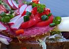 Dziś na śniadanie kawałki marynowanego, wędzonego łososia w towarzystwie białego twarożku z pieprzem tongue