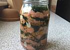 Układamy warstwę ryby, czosnek, koperek, pieprz, olej (w między czasie co którąś warstwę można posolić z młynka i skropić sokiem cytryny - nie koniecznie). I tak do końca porcji łososia, pamiętając by zakończyć koperkiem i olejem.