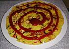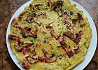 Ciasto naleśnikowe troszkę bardziej gęste niż normalnie, do niego dodałam troszkę drobno posiekanej cebuli czerwonej, papryki czerwonej, cukinii i szczypiorek, a i szczyptę kurkumy, a w trakcie smażenia jeszcze na wierzch plasterki pieczarki, Z keczupem smakuje wyśmienicie.