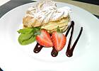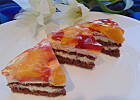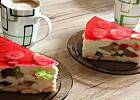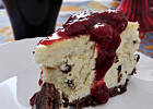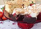 Sernik (quark + ricotta) z czekoladą, na spodzie z ciasteczek orzechowych nadziewanych kremem czekoladowym. :) Z sosem truskawkowym.