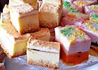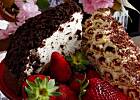 Sernik z toffee, orzechami, czekolada i rodzynkami na orzechowo- ciasteczkowym spodzie z piankami marshmallow, brownie z biala czekolada, truskawkami i beza.