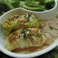 Gołąbki w sosie pieczarkowym (wywar z kostki mrożonej z podgrzybków Domii) i lekko poduszone z chrupącym liściem kapuścianym.
