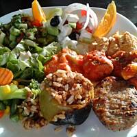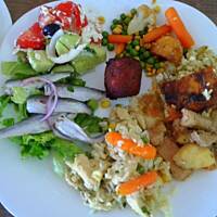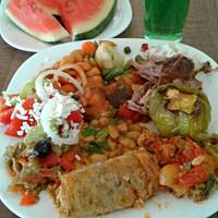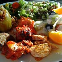 Starałam się wszystkiego chociaż spróbować, dlatego moje talerze były aż przepełnione, ale Ślubny zawsze przychodził mi na ratunek, więc mogłam nakładać do woli ;). Oczywiście najwięcej jadłam warzyw. Były przepyszne duszone bakłażany, papryki, kabaczki i soczewica, pieczone cukinie z serem, nadziewane i grillowane papryki, do tego pachnące pomidory, ogórki, oliwki i inne surówki. Do wszystkiego były różne sosy, z których mało korzystałam, żeby nie zabijać smaku warzyw.
