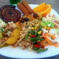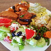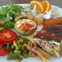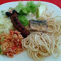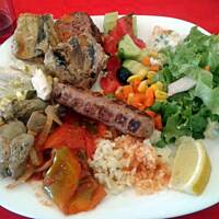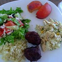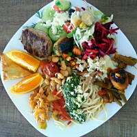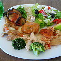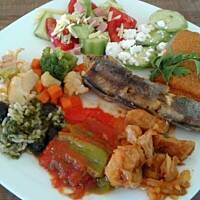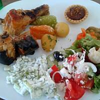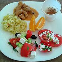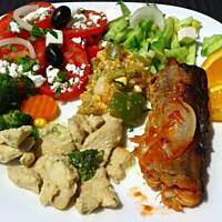 Chciałam też chociaż skosztować dodatków w postaci ryżu przyprawionego sminduchem albo czerwoną czubricą lub ze szpinakiem i czarnymi oliwkami, pozytywnie zaskoczyła mnie również bułgarska musaka z większą ilością ziemniaka niż w w greckiej, a lekko rozczarowało coś w rodzaju pieczonej polenty, bo było wyjątkowo mdłe.