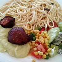 Z potraw mięsnych dopatrzycie się na talerzach przeróżnych aromatycznych kotletów, pachnących mieszankami z czubricą i merudiją, podłużnych kotlecików z mięsa najczęściej wieprzowego lub mieszanego, to grillowane kebabcze, oraz okrągłe kulki kjufte, z przewagą wołowiny. Do tego pachnący przyprawami i warzywami gulasz - kawarna, gołąbki w liściach winogron, pyszne drobiowe potrawki i kawałki cudownego indyka pieczonego w całości i ciętego prosto na talerz.