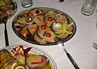 Kiedy sama planuję przyjęcie podaję najpierw przystawkę ( np pieczarki z jajami przepiórczymi na ciepło- 2 duże pieczarki na osobę- są pyszne i pobudzą apetyt) później zupę w małych bulonówkach, dania na ciepło, deskę serów, kawę i ciasto a na końcu na luzie do alkoholu sałatki, przekąski na zimno Nie ma zwykle problemu z ilością przekąsek, bo wszyscy są już tak najedzeni, że zjadają już ich niewiele.