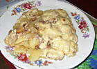 PS. Moje modyfikacje: ziemniaki pokroiłam w plastry, wrzuciłam na wrzątek i obgotowałam, pieczarki pokroiłam w półplastry i udusiłam na maśle (mam za słaby piekarnik), a ponieważ łopatkę miałam całą i to zamrożoną, użyłam piersi z indyka