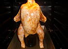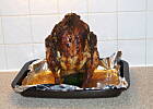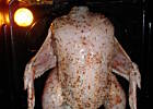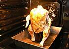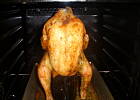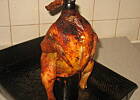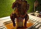 Eee, jakoś mi nie wyszedł :(. Posadziłam kurczaka na butelce po piwie, być może za "płytko" i kurczak piekł się za blisko górnej ścianki piekarnika. Efekt był taki, że szyjka i górna część piersi prawie się zwęgliy, ale reszta pozostała blada. Pod koniec pieczenia położyłam kurczaka w poziomie w brytfance, żeby przyrumienił się również w innych miejscach. Mimo to jakoś nie jestem zadowolona z efektu. Może to mój piekarnik (nie ma grzania od dołu), a może ja coś poknociłam. Cóż, pewnie spróbuję jeszcze raz za jakiś czas :).