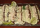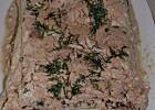 Zamiast obskubywać makrelę dałam tuńczyka z puszki - potrzebne są 4 puszki tuńczyka w sosie własnym (trzeba odlać wodę), przy czym jedna musi być w kawałkach - do dekoracji na wierzch. Trochę przekombinowałam, bo zamiast twarogu do tuńczyka dałam serek z opakowania i wszystko zmiksowałam w termomiksie - no i masa się rozciapała. Wystarczyło masę połączyć w misce i byłoby Ok. Smakowo jest niezłe - zdecydowanie bardziej wyraziste w smaku niż z makrelą - w każdym razie do dopracowania na następny raz. A oto efekt: