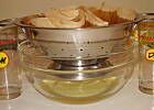 Do dość dużej szklanej miski wkładam durszlak, na nim układam kilka filtrów do kawy, otwierając je jak torebki gotowe do napełnienia. Następnie wlewak stopniowo do każdego po trochę nalewkę przeznaczoną do filtrowania. Uzupełniam, uważając żeby nie wydostała się ani odrobina poza filtr. Teraz cierpliwie czekamy aż nalewka się przefiltruje...:)))