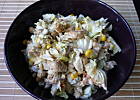 sałatka pycha:) w dzień przyrządzenia świetna a na drugi dzień kupiłam placki tortilla zawinełam w nie sałatke i włożyłam na chwile do piekarnika:) palce lizać.