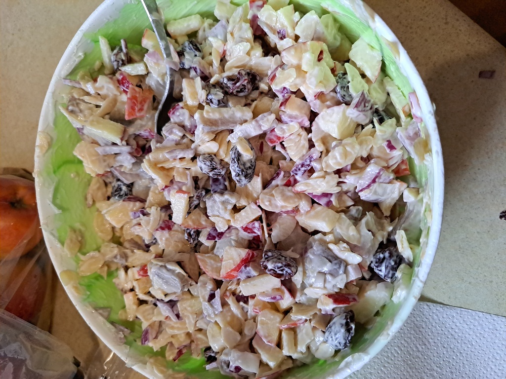 Sałatka dobra, moim zdaniem jezcze lepsza następnego dnia gdy rodzynki i migdały spęcznieją i oddadzą swój smak