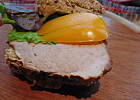 W zasadzie już wszystko zostało napisane: delikatny, soczysty i miękki. Zupełnie nie przypomina tych schabów kupnych, które mają w nazwie "pieczony", ale smak zupełnie inny. Część podałam na zimno, do kanapek z dodatkiem żurawiny. Drugą część potraktowałam domowym sosem grzybowym i odgrzałam na obiad. Dzięki temu wróciwszy ze spaceru mieliśmy gotowy obiad (kasza była przygotowana już wcześniej i wysłana "pod kocyk"). Do tego sałata lodowa z dużą ilością jogurtu naturalnego.