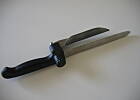 Różyczko miła, - a może gdybyś miała taki nóż, pomoc Mamy czy Babuni przy przekrawaniu biszkoptów nie byłaby konieczna, i bez trudu kroiłabyś biszkopt na 3 - a nawet 4 placki ? Powiększ zdjęcie i popatrz - nóż ma b. ostre ząbkowane ostrze , i taki ogranicznik pozwalający na idealnie równe krojenie plastrów itp..... Z boku jest pokrętło, którym regulujesz grubość krojonego produktu - od 1 milimetra - do 3,5 cm. Nóż jest przeznaczony do krojenia chleba i wędlin - a więc " pionowo " - prawą ręką. I tu wada tego noża, bo biszkopt kroisz poziomo - ostrze wchodzi w ciasto, a ogranicznik " idzie " po wierzchu. Więc biszkopt musisz kroić lewą ręką. Ale poradziłabyś sobie z tym szybciutko ( skoro ja sobie radzę ? )