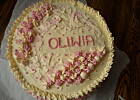 Tort przepyszny, zrobiłam na chrzciny, upiekłam biszkopt w większej tortownicy (29cm), a masę zwiększyłam do 1,5 porcji. Wierzch tortu udekorowałam kremówką i masą malinową. Poncz-słodka woda z cytryną i olejkiem migdałowym. Opinie tortu były "pozytywne, pasowało połączenie śmietany ze smakiem porzeczki i migdałów,nie za słodki,taki akurat". Jedyne zdjęcie,jakie mam to w trakcie zasychania masy, jeszcze z papierem do pieczenia naokoło,potem to już tort odjechał...Magda -dziękuję za prosty,ale jak smaczny torcik.